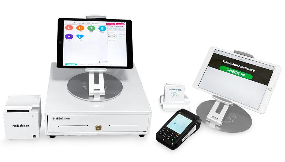 Máy Nailsolution (POS + bookkeeper): Giá cả phải chăng - không lệ phí hàng tháng - 2 ngôn ngữ - nhỏ gọn - đặc biệt, rất dễ sử dụng.